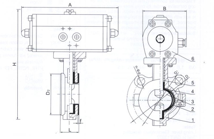1.閥體 2.蝶圈 3.蝶板 4.四氟圈 5.碟形彈性墊圈 6.氣動裝置