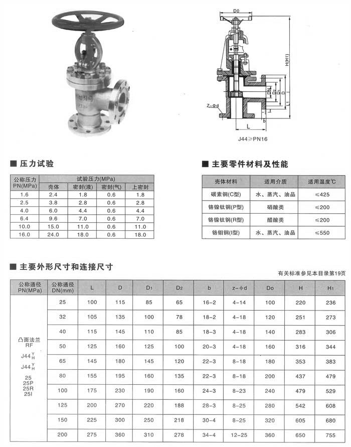 J44H角式截止閥/鑄鋼截止閥 截止閥屬于強制密封式閥門,所以在閥門關閉時,必須向閥瓣施加壓力,以強制密封面不泄漏。當介質由閥瓣下方進入閥門時,操作力所需要克服的阻力,是閥桿和填料的摩擦力與由介質的壓力所產生的推力,關閥門的力比開閥門的力大,所以閥桿的直徑要大,否則會發生閥桿頂彎的故障。近年來,從自密封的閥門出現后,截止閥的介質流向就改由閥瓣上方進入閥腔,這時在介質壓力作用下,關閥門的力小,而開閥門的力大,閥桿的直徑可以相應地減少。同時,在介質作用下,這種形式的閥門也較嚴密。我國閥門“三化給”曾規定,截止閥的流向,一律采用自上而下。本閥要水平安裝   截止閥開啟時,閥瓣的開啟高度,為公稱直徑的25%~30%時,流量已達到最大,表示閥門已達全開位置。所以截止閥的全開位置,應由閥瓣的行程來決定。J44H角式截止閥/鑄鋼截止閥