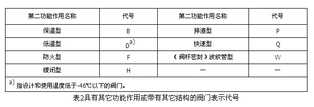 當閥門具有其它功能作用或帶有其它結構時,在閥門類型代號前再加注一個漢語拼音字母,按表2的規定。